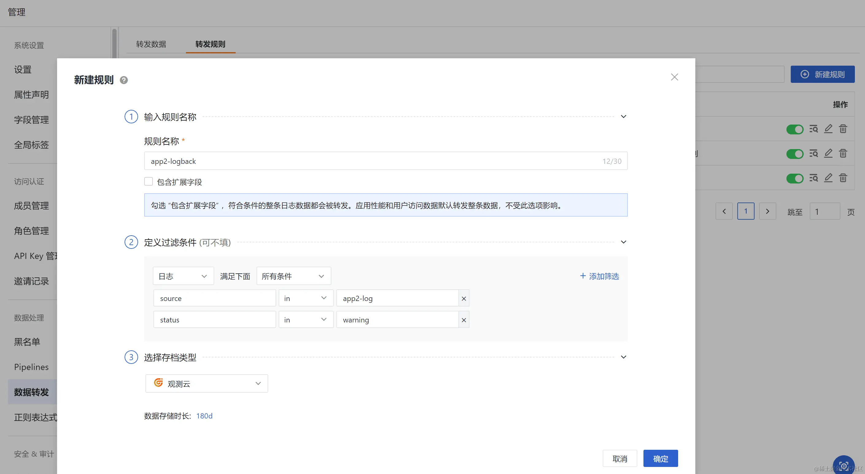注意:该规则下的日志数据最低存储默认为 180 天,可以前往管理 > 设置 > 变更数据存储策略中修改数据转发存储策略。