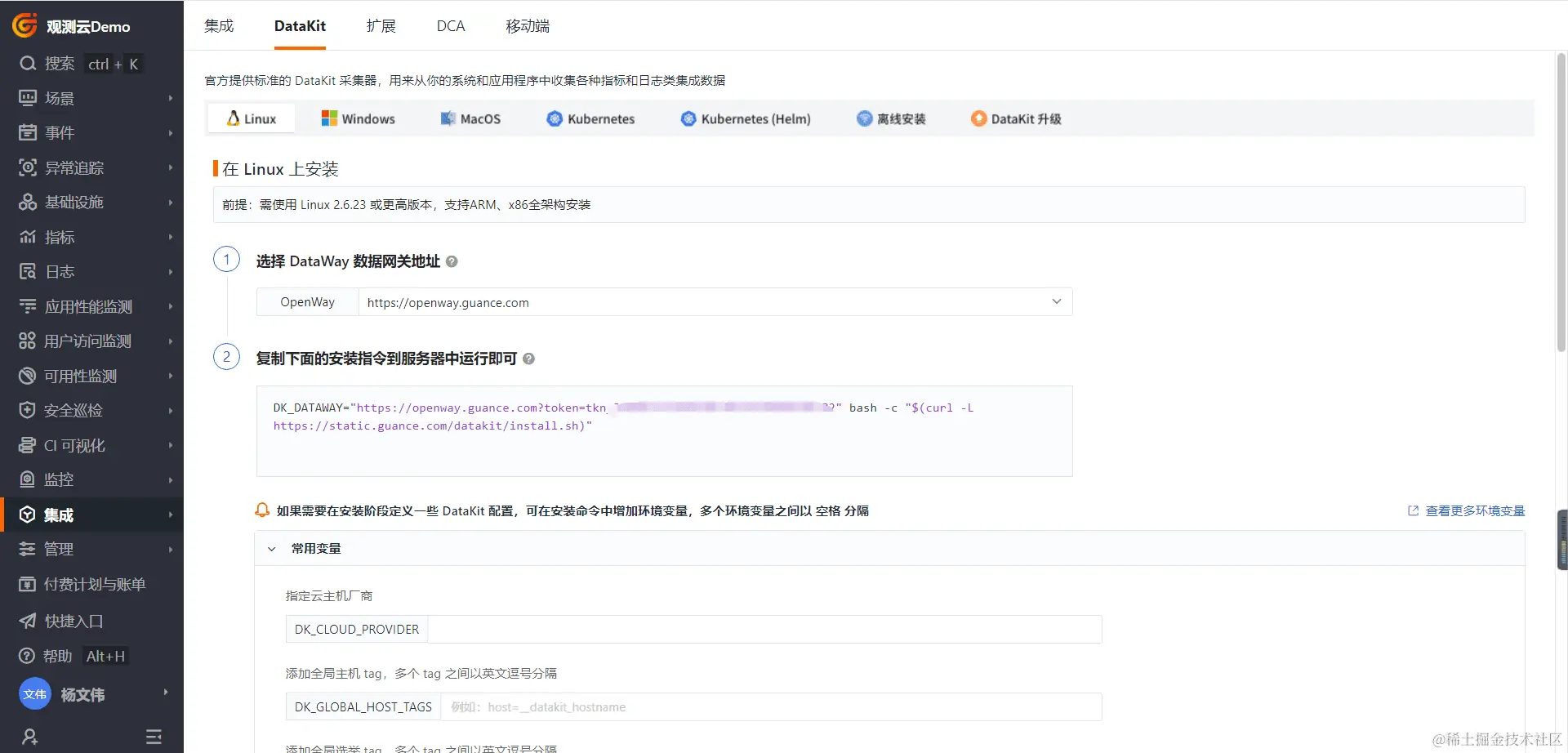 - 登录观测云控制台,点击[集成]->[DataKit]