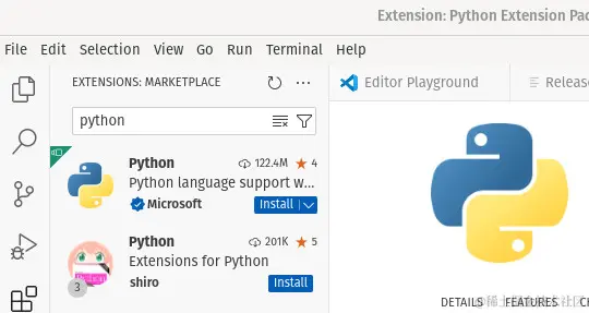 下一步是启用 Python 支持。为此,请单击侧边栏中的扩展图标(看起来像一个小 Tetris 图标,位于栏的中间附近)。在结果菜单中,键入 python 并等待结果。单击与官方 Python 扩展关联的安装按钮。它应该是顶部结果(请参阅下图)。