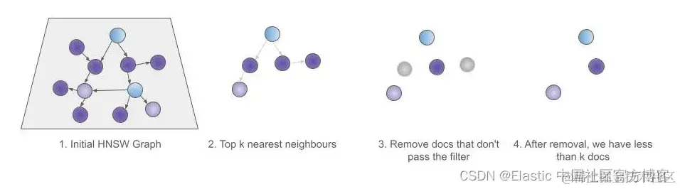 然而,近似搜索在过滤时采用了不同的方法。在使用 HNSW 进行近似搜索时,查询过滤器将在检索到前 k 个结果后应用。这就是为什么与 kNN 查询一起使用查询过滤器被称为 kNN 的后过滤。