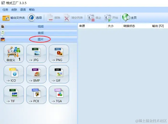 Format Factory不仅支持转换视频格式,还可以快速转换图片格式。点击**【图片】图标,选择图片要转换的格式。在打开的窗口上传图片,设置好参数后,就可以点击【开始】**进行转换了。