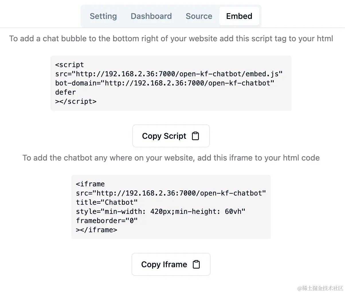 打开管理后台菜单切换到embed,复制两个代码即可实现一键嵌入,这两个代码片效果分别如下:一个是iframe嵌入一个聊天窗口,一个是在页面右下角点击弹出聊天窗口。