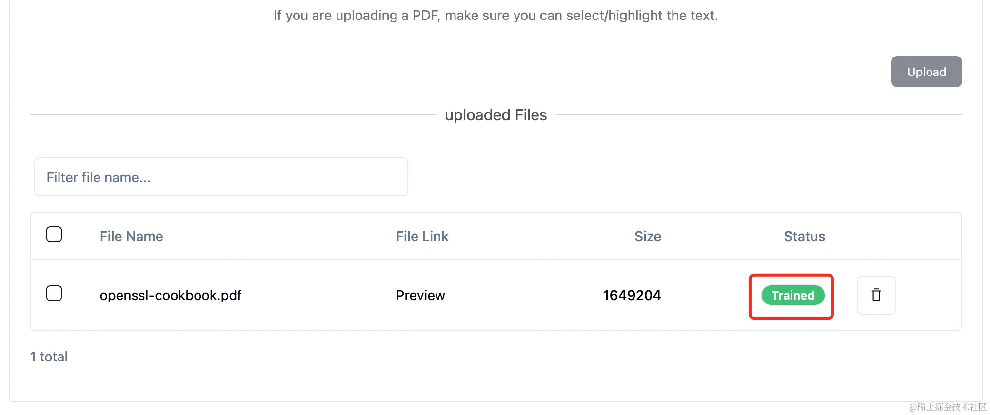 在admin页面,在管理后台上,上传文档展示的状态都是 Trained 。