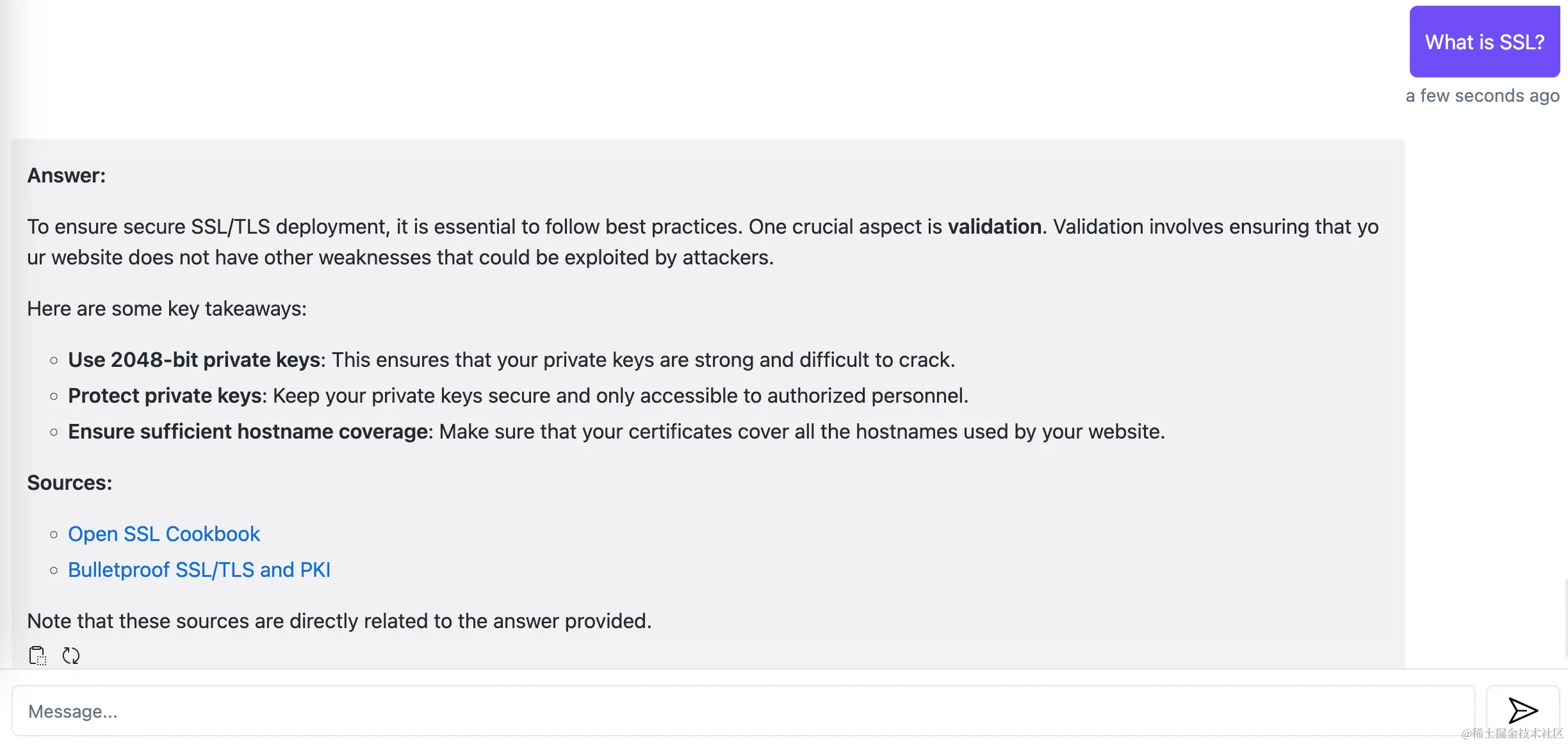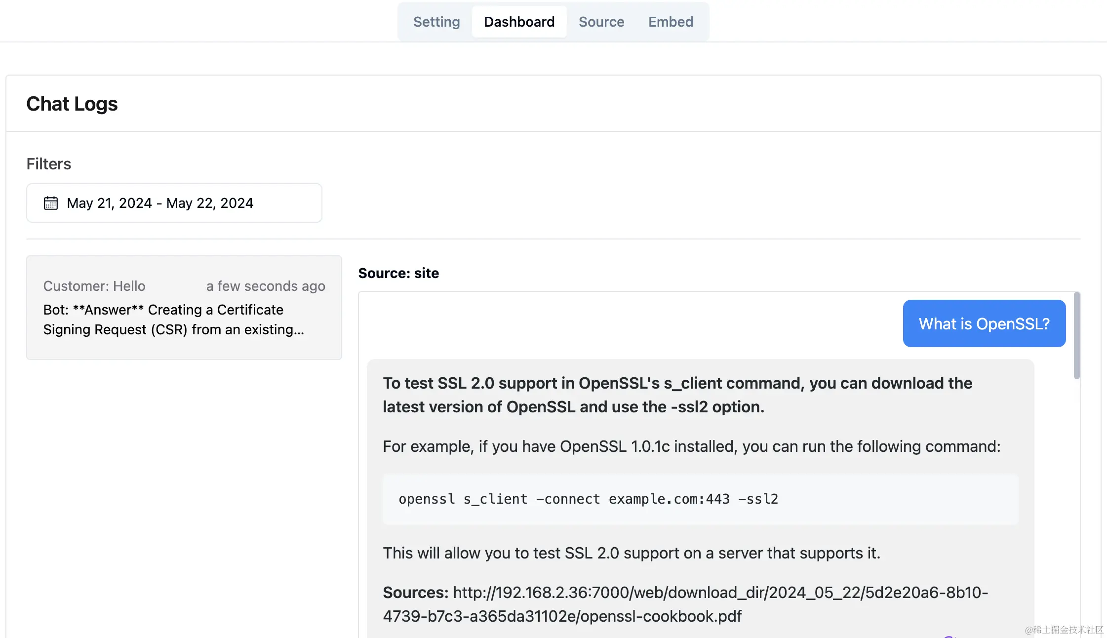 构造Prompt中使用。我在这里要搭建关于OpenSSL Cookbook的智能客服,所以改写为OpenSSL。 - 调整 URL_PREFIX 以匹配你的网站的域名。