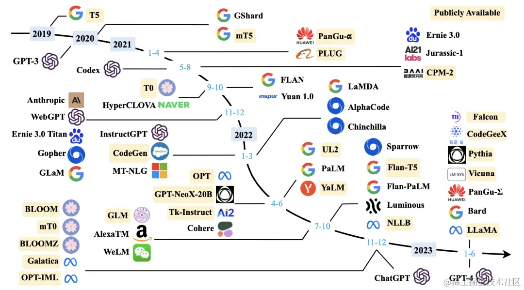 除了OpenAI外,国内外还有非常多的公司参与大模型赛道(国内的报道可以参考晚点发布的「大模型创业潮:狂飙 180 天」,见参考文献15,不过大模型发展太快了,一天一个样,可能等读者看到时,又有新的创业公司加入大模型挑战赛了,或者有更先进、更厉害的模型出现了),下面图2是截止到2023年6月底国内外重要的大模型的发展脉络。
