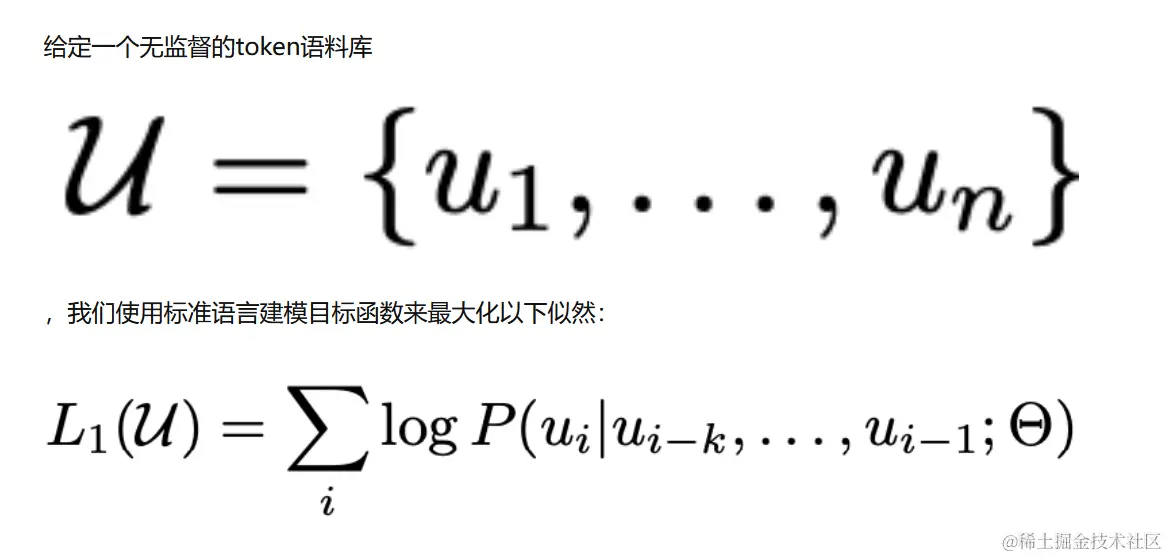 其中k是上下文窗口的大小,条件概率P使用参数为θ的神经网络建模。这些参数使用随机梯度下降法进行训练。一般用多层Transformer解码器(见参考文献20)作为语言模型(即P),它是Transformer的变体。