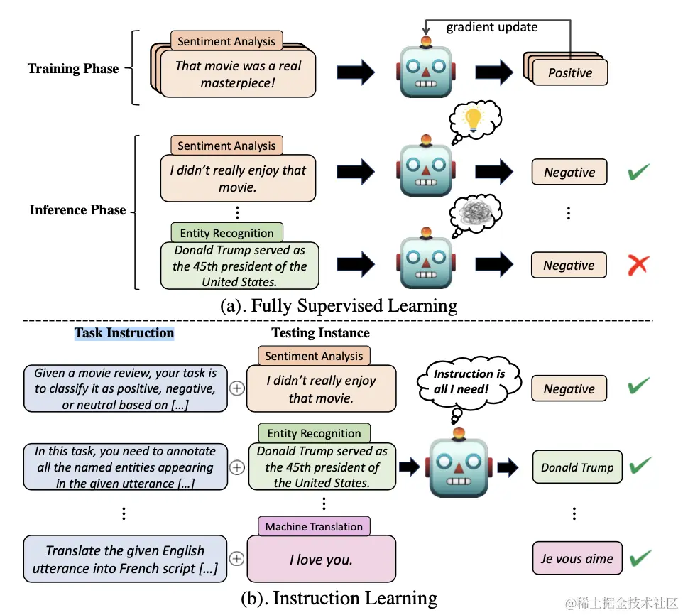 指令微调通常更有效,因为只有中等数量的样本用于训练。由于指令微调是一个有监督的训练过程,其优化在几个方面与预训练不同,例如训练目标(比如序列到序列的loss)和优化配置参数(比如较小的批大小和学习率)。