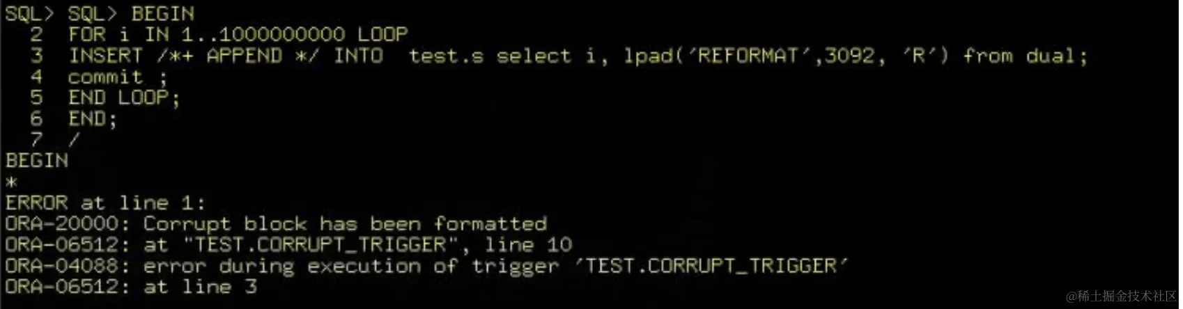 RAISE_APPLICATION_ERROR(-20000, 'Corrupt block has been formatted');
