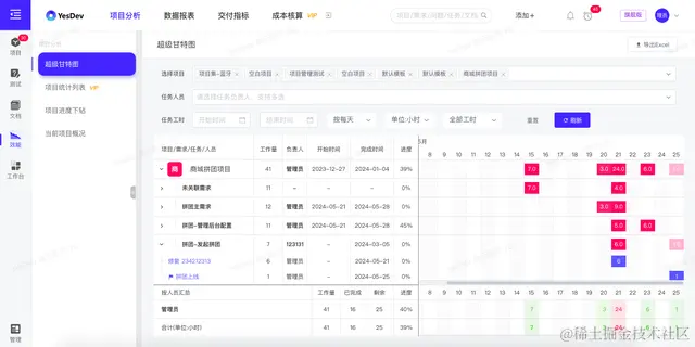 可以合并多个项目,实时查看人员交叉、项目交叉的工作情况。