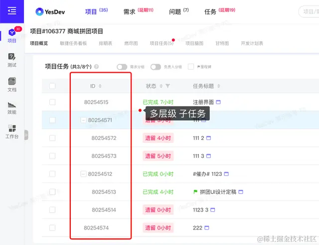 设置后,在项目任务列表、需求任务列表、问题任务列表,都能同步查看多层级、无限层级的子任务列表。