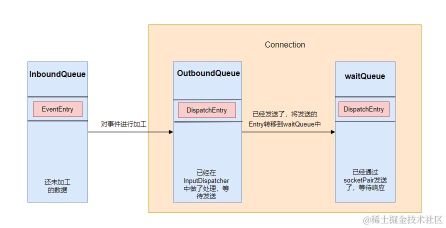 inboundQueue:还未加工的数据outboundQueue:已经在InputDispatcher中做了处理,等待发送waitQueue:已经通过socket发送了,等待响应