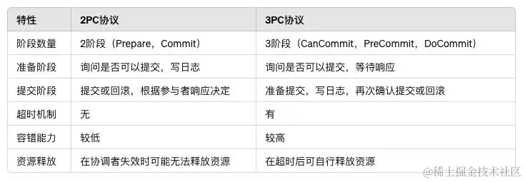 为了更清晰地了解2PC和3PC协议之间的区别,我们将其总结如下表:
