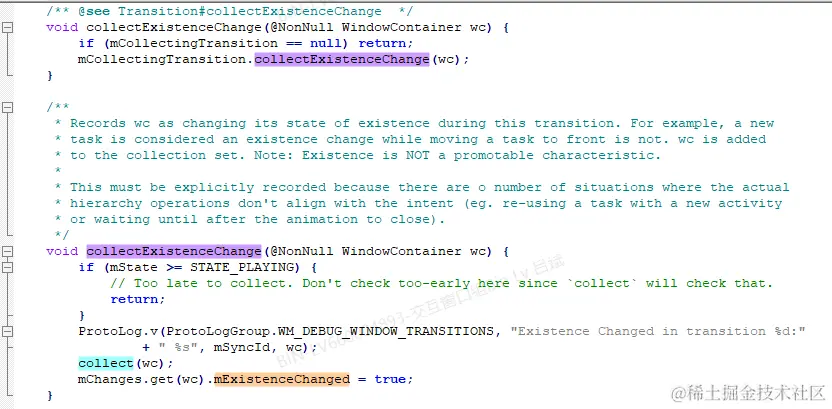 将从正在收集的这个Transition的mChanges中找到这个新建的ActivityRecord的ChangeInfo对象,将其成员变量mExistenceChanged置为true,表示这个WindowContainer在本次改变前后的存在性发生了变化,即从无到有(OPEN),或者从有到无(CLOSE)。