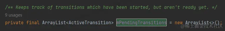 成员变量mPendingTransitions是一个ActiveTransition的队列,用来保存那些已经启动,但是还没有就绪的Transition。
