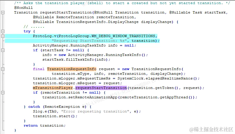 该注释已经解释的很清楚了,现在我们已经在WMCore端封装好需要传递的信息了,下一步就是调用ITransitionPlayer.requestStartTransition将这些信息发送到WMShell端,来通知那边创建一个Transition。
