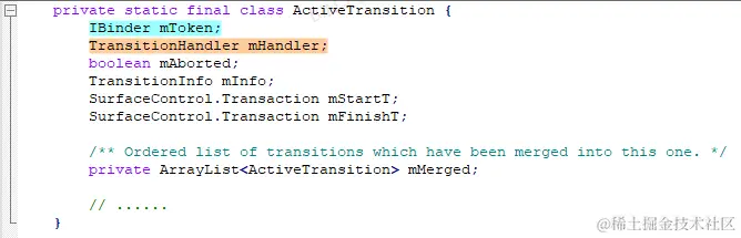 ActiveTransition中有一个IBinder类型的mToken成员,用来保存从WMCore中传来的Transition的token,那么可以认为WMCore端的Transition和WMShell端的ActiveTransition是一个一一对应的关系,这样也有助于理解TransitionController.requestStartTransition的注释: