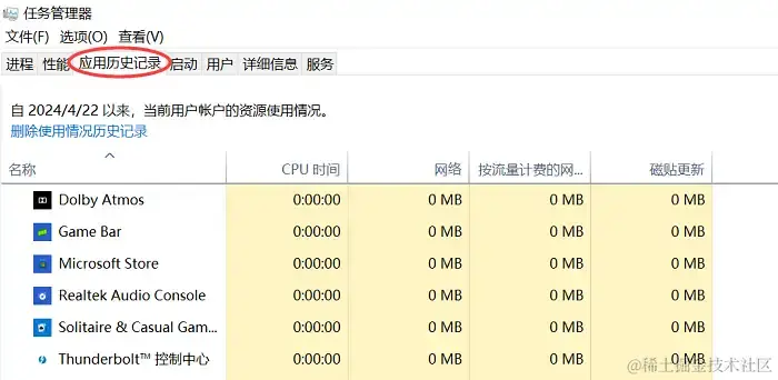 (2)在任务管理器中,切换到 【应用历史记录】选项卡,可以查看各个应用或程序的使用时长。