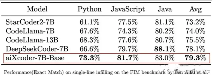 测试显示,aiXcoder-7B Base版结合单文件上下文的代码补全能力超越StarCoder2、CodeLlama等一众模型,在Python、JS和Java语言上综合得分最高。