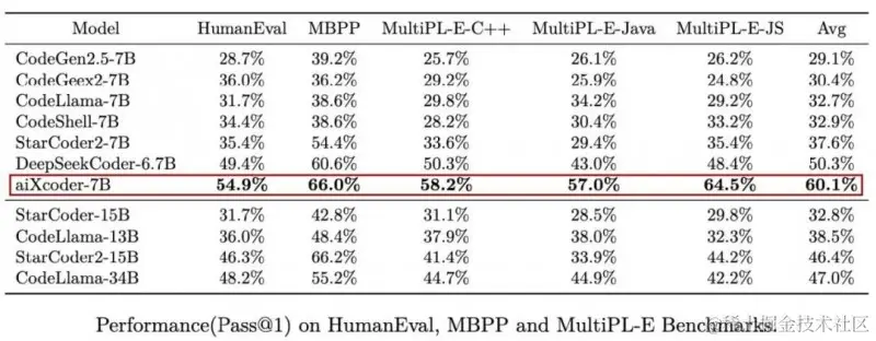 尽管aiXcoder只是一个7B大小的模型,但在HumanEval、MBPP和MultiPL-E等主流代码生成评测集上,它平均得分居然超过340亿参数的Codellama。要知道,后者来自Meta、基于Llama2,可是开源界最先进的AI编程大模型之作。