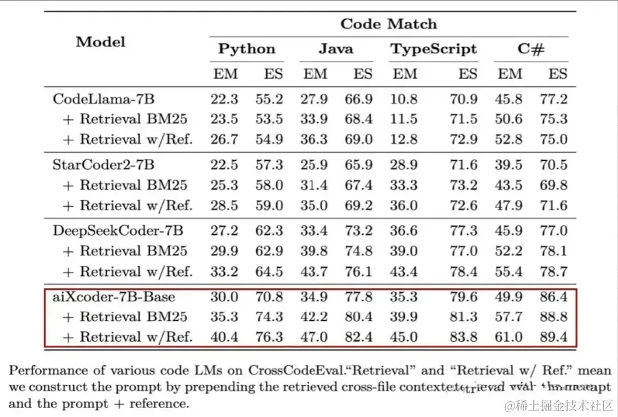 测试显示,在贴近真实开发场景的评测集CrossCodeEval上,aiXcoder-7B一举拿下了同级别模型的最好效果:
