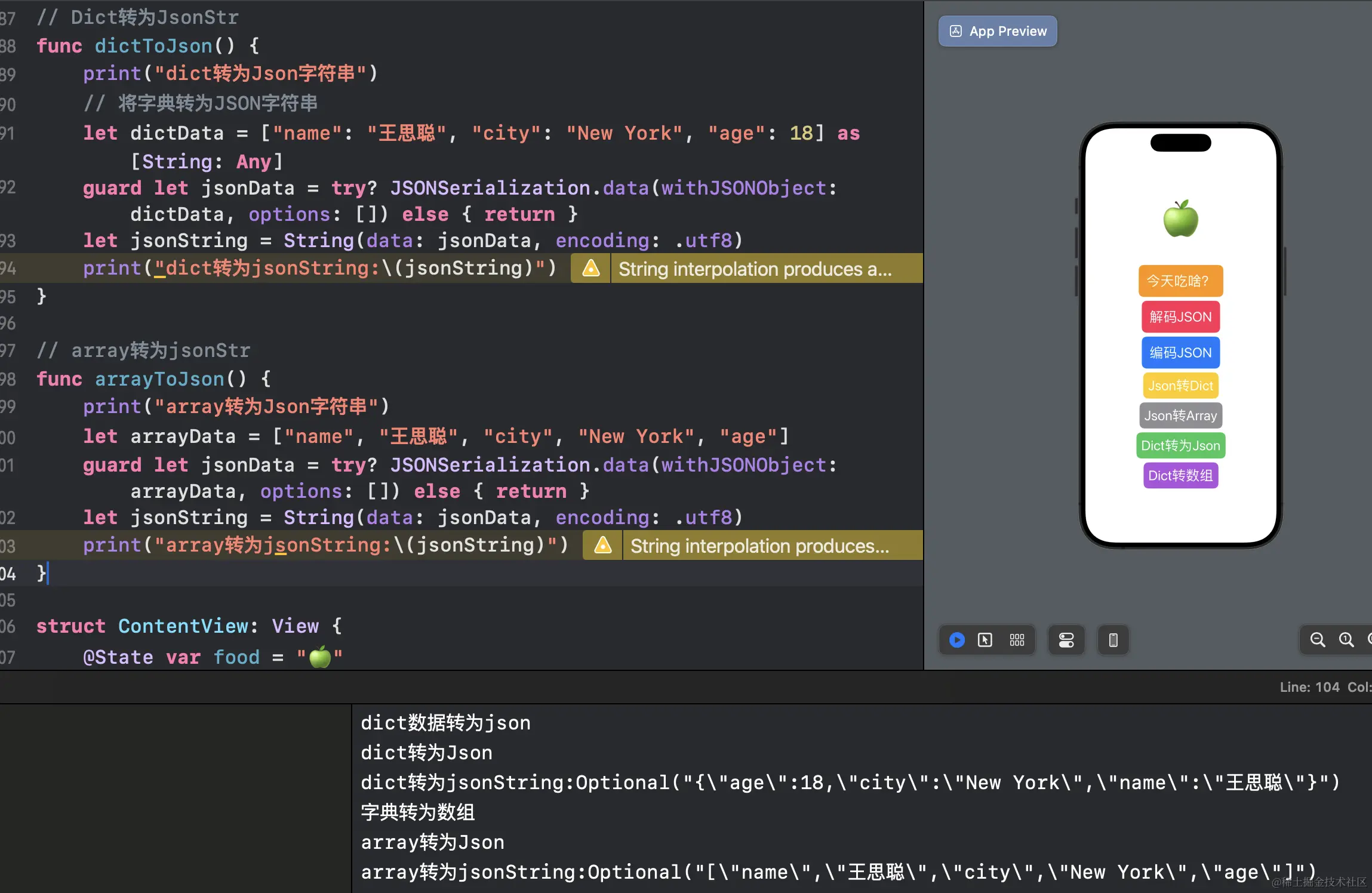 在Swift中,你可以使用JSONSerialization类将JSON字符串转换为字典。要将 Swift 字典转换为 JSON 字符串,我们可以使用JSONSerialization类的data(withJSONObject:options:)方法。这个方法将字典转换为二进制数据,然后我们可以使用String(data:encoding:)方法将其转换为字符串形式。