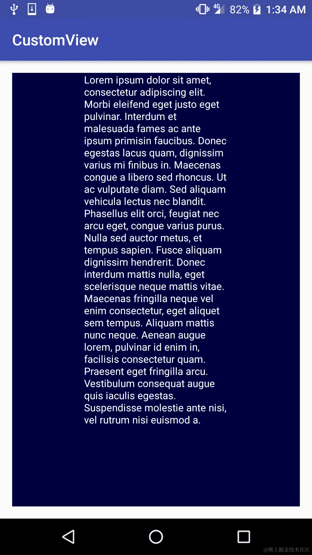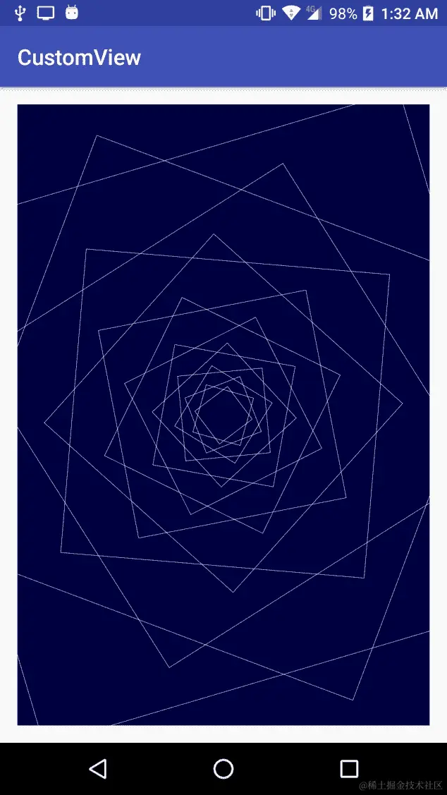 如果backgroundBitmap为null,这意味着它无法加载图像;因此,为了安全起见,我们应始终检查。这段代码只会在我们自定义视图的左上角绘制图标,尽管我们可以通过设置不同的坐标(这里我们使用了0,0)或对我们的canvas应用之前做过的变换来改变其位置。例如,我们可以根据用户选择的角度来旋转图像: