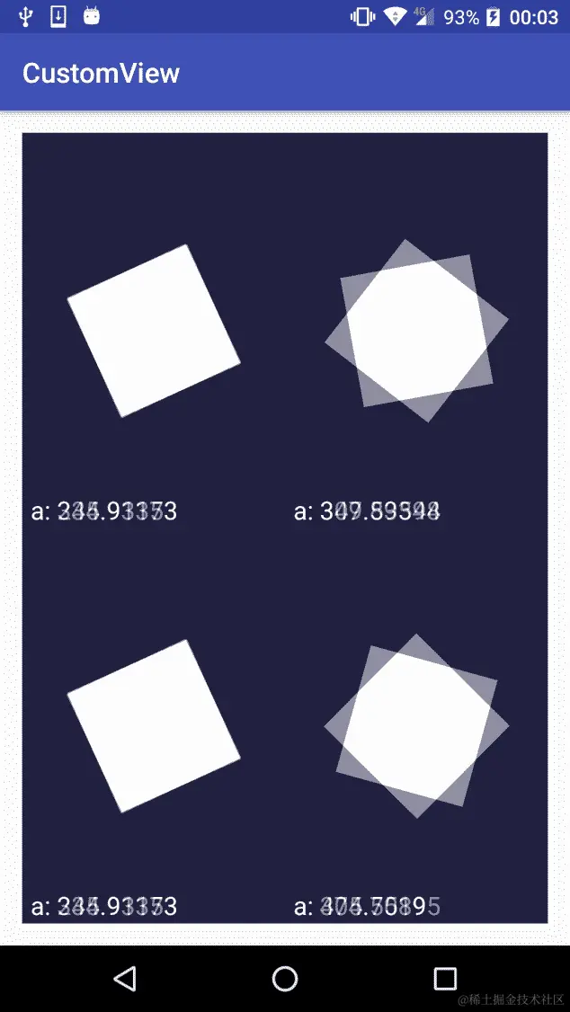 我们可以配置动画行为的许多方面:从动画重复模式、重复次数和插值器类型。让我们使用本章开始时使用的同一个示例来看一下它的实际应用。让我们在屏幕上绘制四个矩形,并使用ValueAnimator的不同设置来旋转它们: