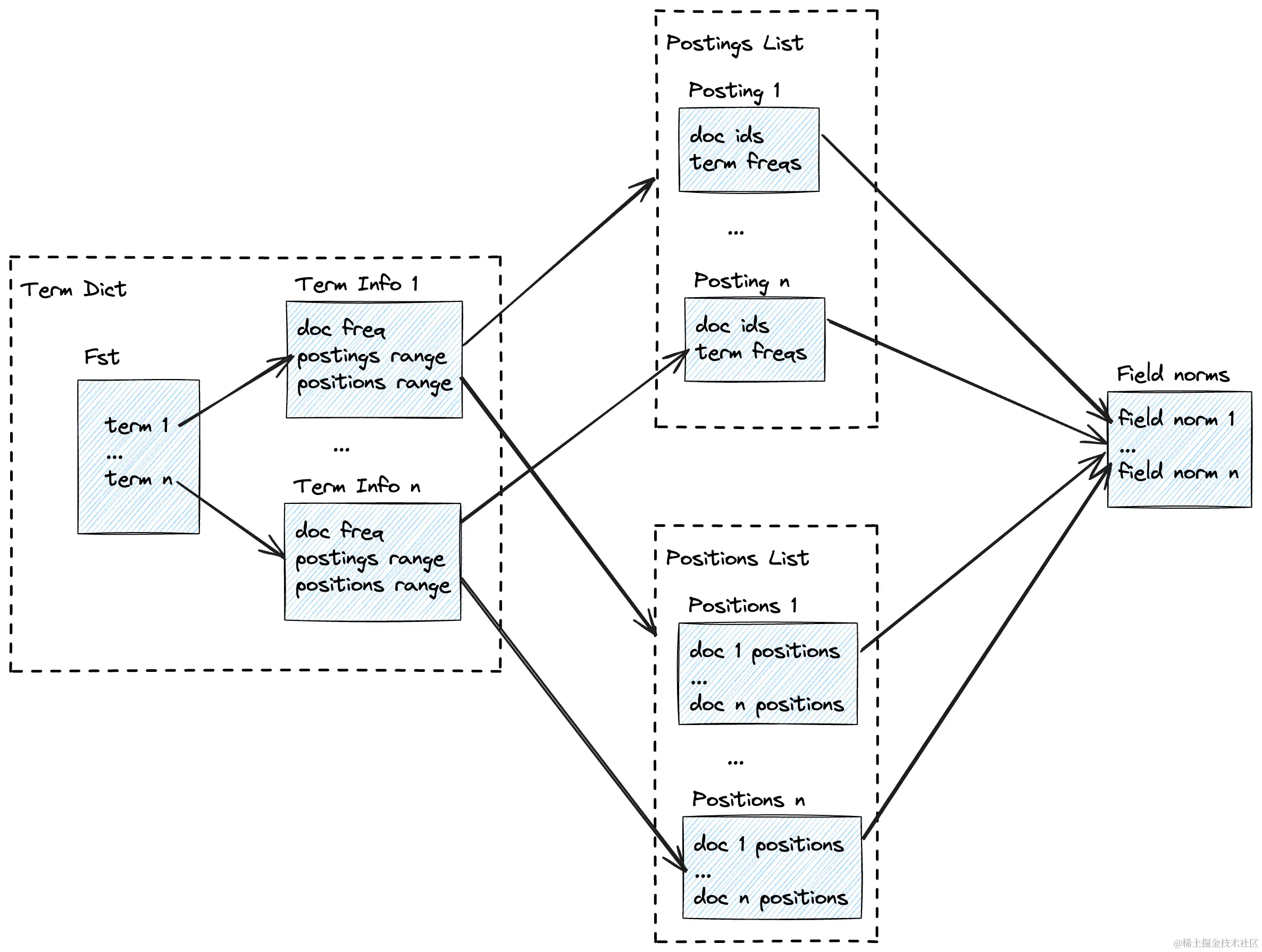 倒排索引的最主要功能是通过一个查询词(Term)找到相关的信息(TermInfo),通常使用 FST(Finite-State Transducer) 构建倒排词典(Term Dict)来实现这个功能。在构建倒排 FST 时,为每个 Term 创建一个状态,并将 TermInfo 作为输出符号附加到该状态。在查询时,给定一个 Term ,可以在 FST 中找到与之对应的最终状态,并从该状态中提取出相应的 TermInfo。关于 FST 更详细的原理可以参考这篇文章的介绍。