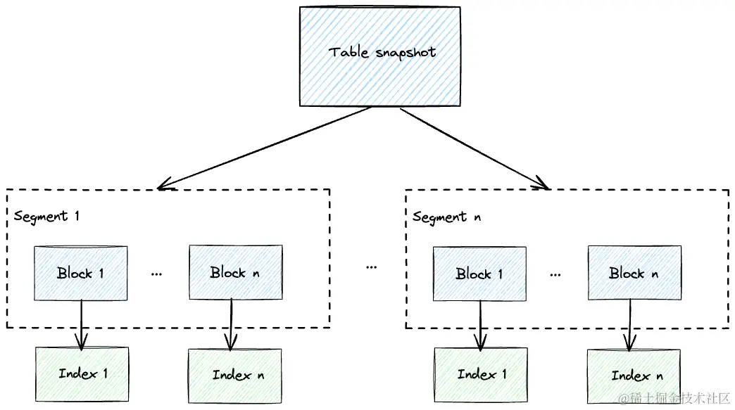 Databend 一个表的数据会分为若干个 segments,并在每个 segment 内进一步分为多个 blocks,这样的设计有利于并行处理和查询数据,从而提高整体的处理速度和响应性能,使得 Databend 能够处理大规模数据集,提供高性能的数据处理和查询能力,并保证数据的可靠性和可用性。在生成索引数据时,我们会为每个 block 生成一个单独的索引文件,相比于包含多个 block 的大索引文件,单独索引的设计有如下的优点: