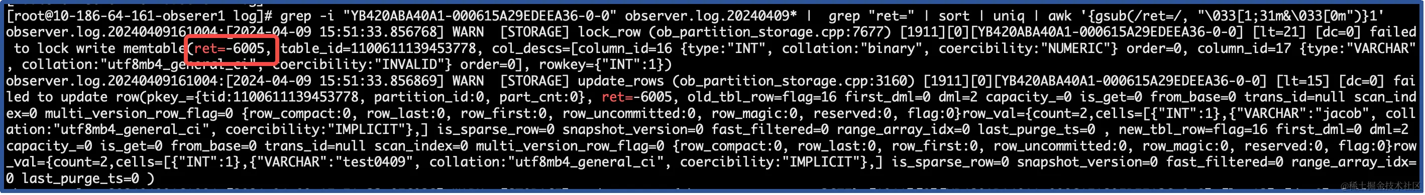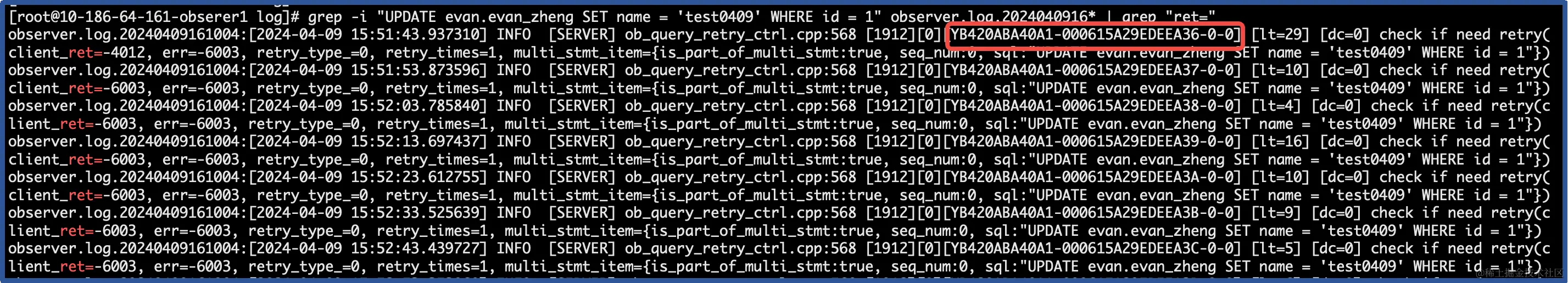 # grep -i "UPDATE evan.evan_zheng SET name = 'test0409' WHERE id = 1" observer.log.2024040916* | grep "ret="