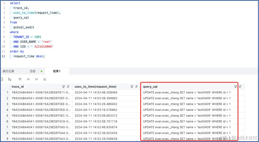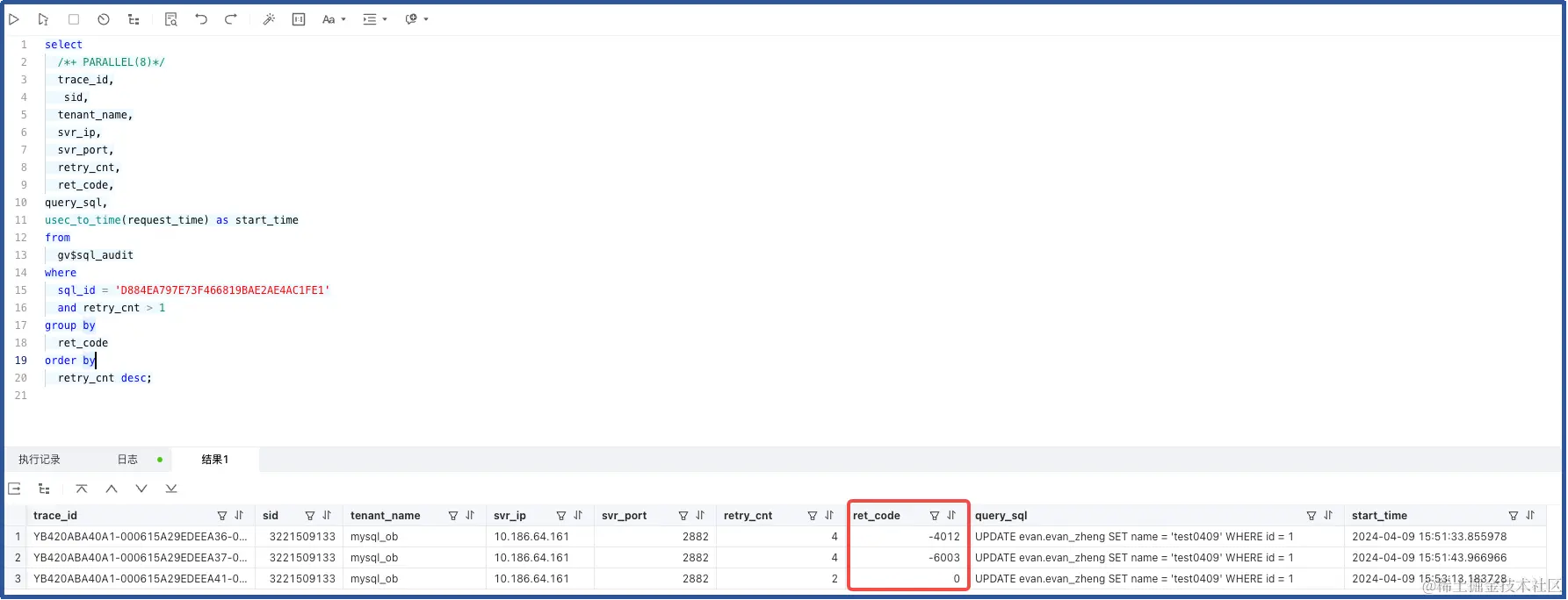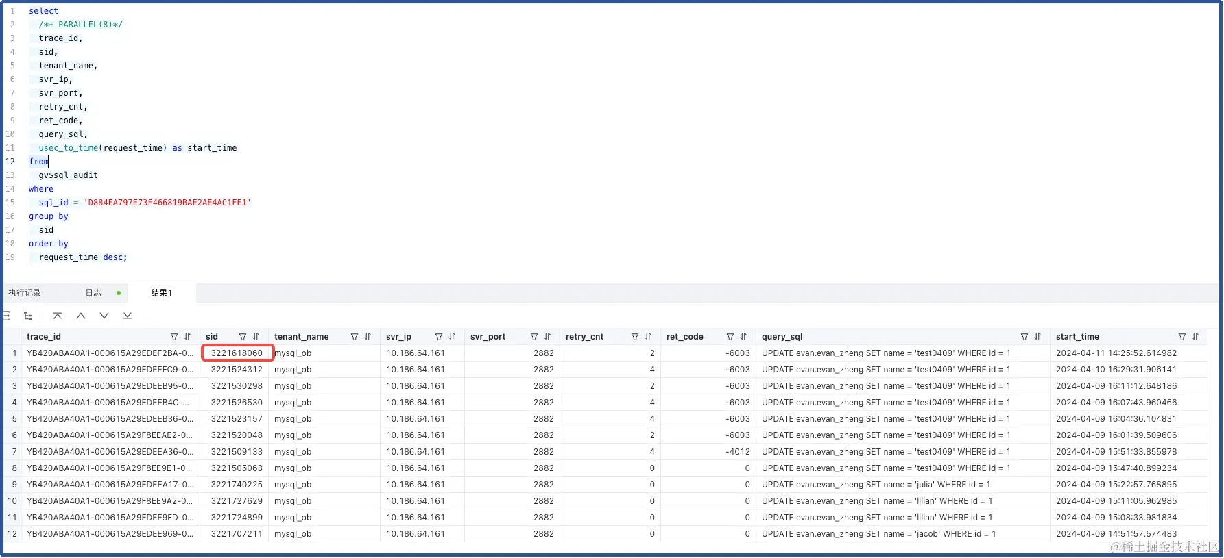 可以看到此处 session_id 与 gv$sql_audit 查询出来的是一致的(即,异常重试的 SQL 的会话)。