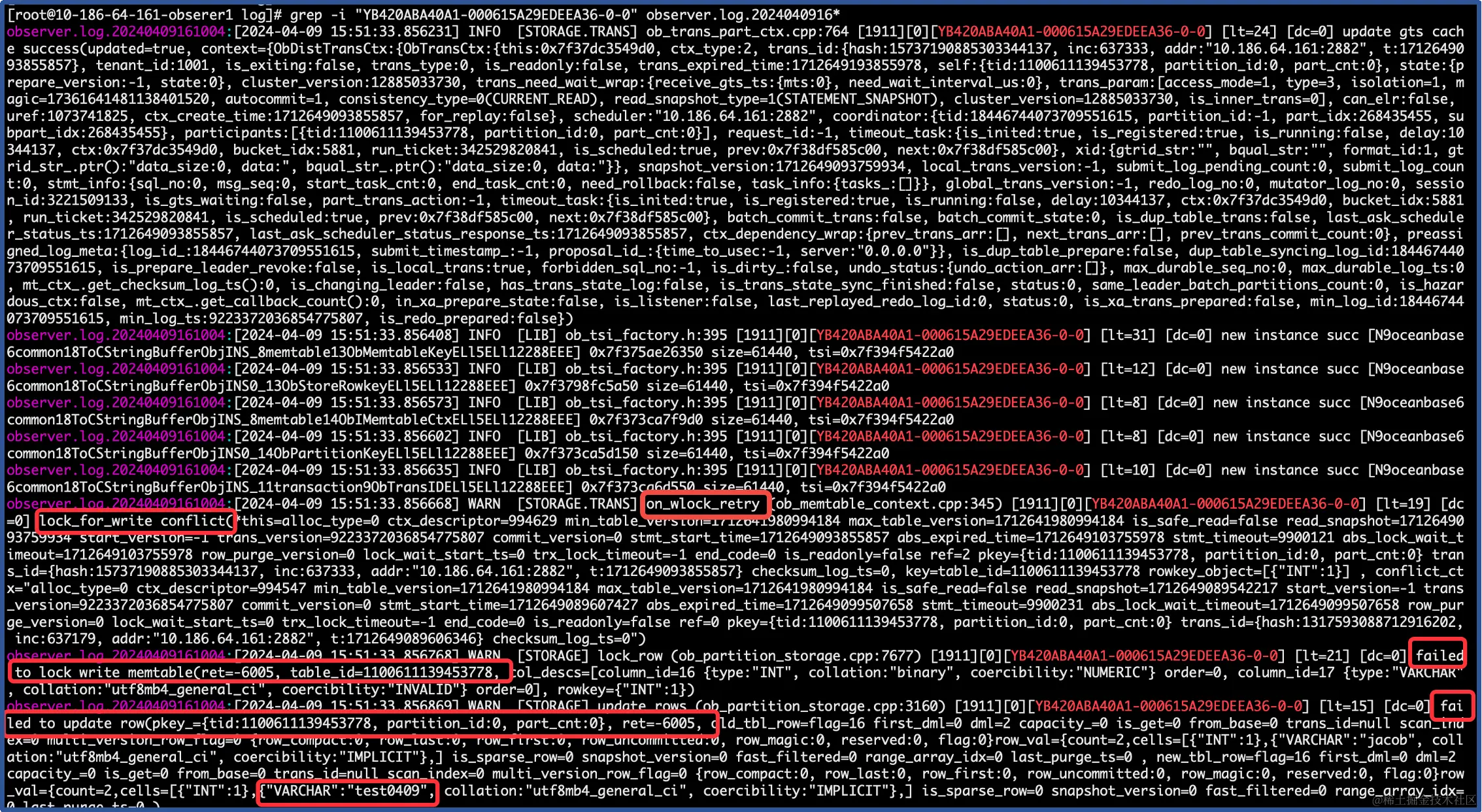 # grep -i "YB420ABA40A1-000615A29EDEEA36-0-0" observer.log.2024040916* | grep "lock_for_write conflict"