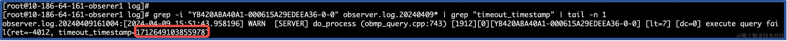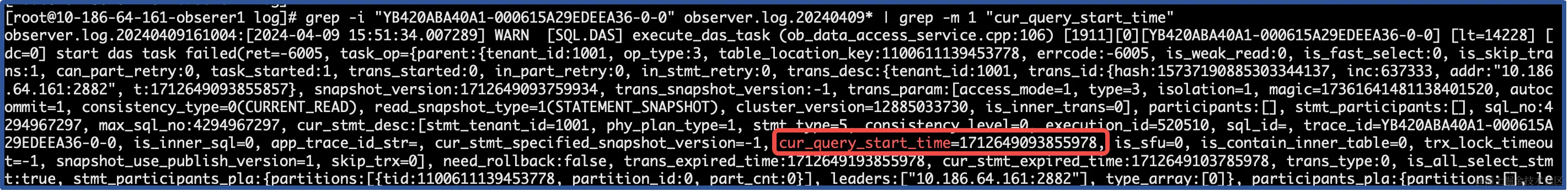 # grep -i "YB420ABA40A1-000615A29EDEEA36-0-0" observer.log.20240409* | grep -m 1 "cur_query_start_time"