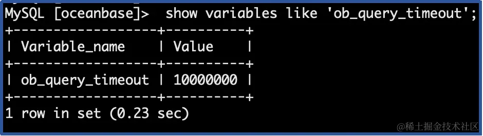 ob_query_timeout: 该变量控制着语句执行时间的上限,语句执行时间超过此值会给应用返回语句超时的错误,错误码为 6212,并回滚语句,通常该值默认为 10s。 - 系统变量