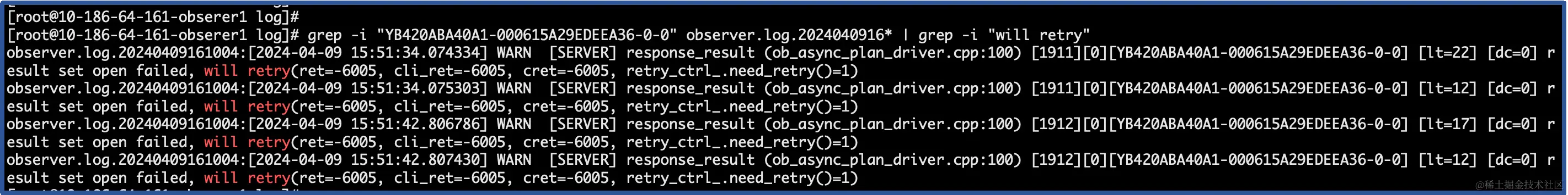 # grep -i "YB420ABA40A1-000615A29EDEEA36-0-0" observer.log.2024040916* | grep -i "will retry"