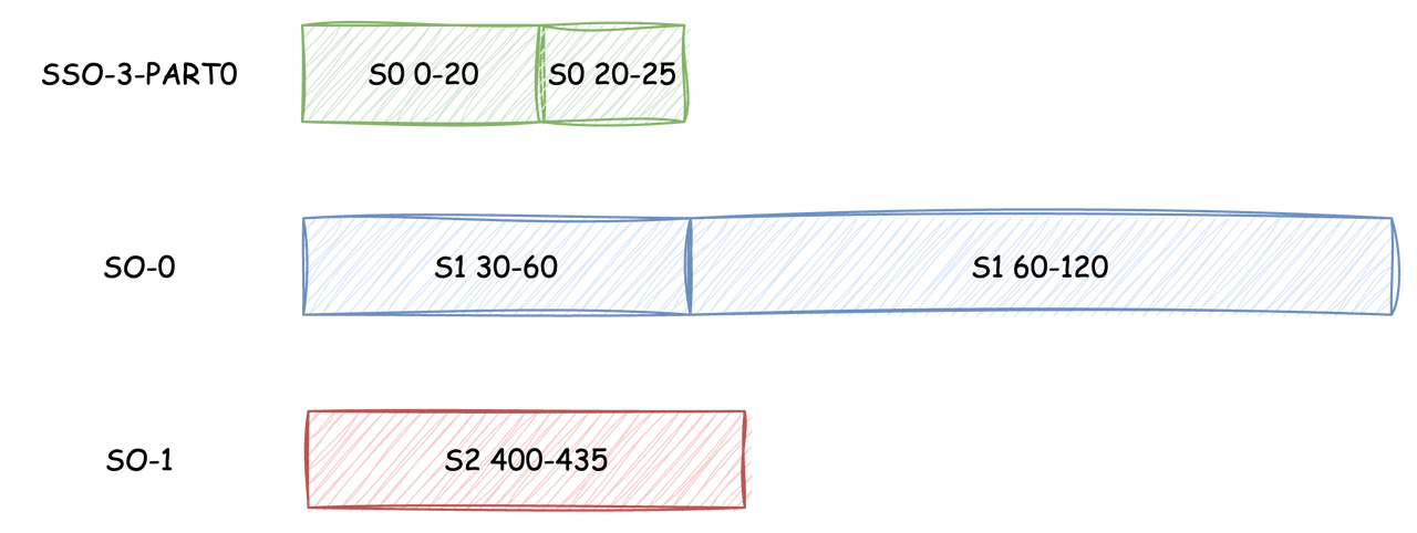 在 SSO Compaction 开始时,会先获取当前节点产生的所有 SSO,并读取各 SSO 的索引文件,解析出各个对象中的 Stream 和对应的数据范围,在这个过程中,各 Stream 过期的数据段将直接被忽略。本文将以下图所示的三个 SSO 的 Compaction 过程为例(需要注意的是,图上的色块长度仅用于表示对应数据段的长度,在这一步中,并未实际读取对应的数据段):