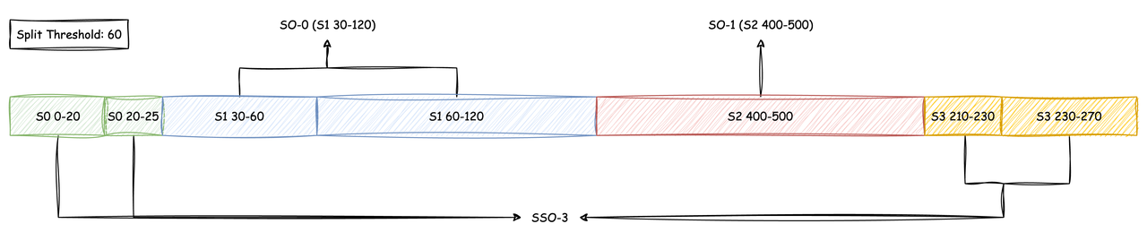 排序完成后,同一 Stream 的连续数据段大于分裂阈值的需要被分裂成单独的 SO,剩余的数据段将组成新的 SSO: