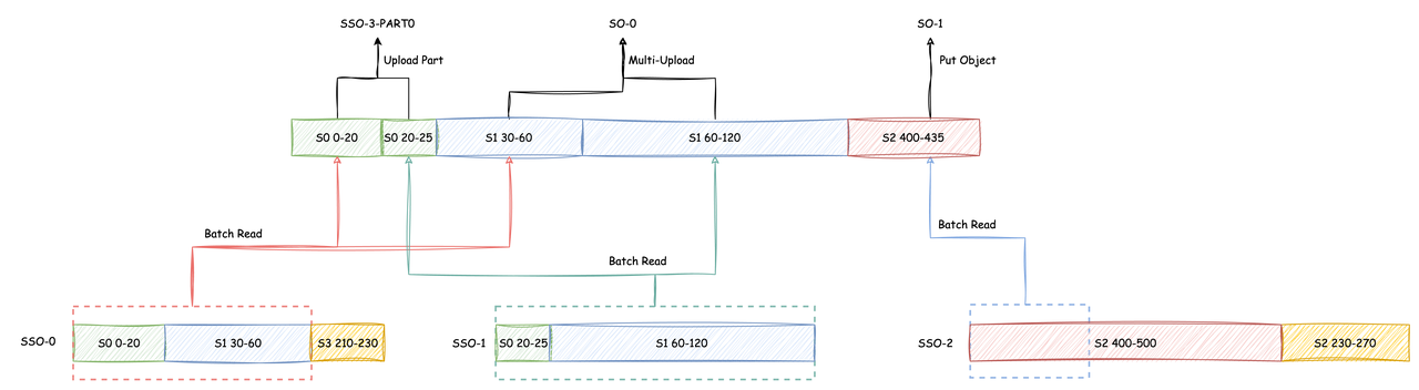 - S0 (0-20) 和 S0 (20-25) 读取完成后作为 SSO-3 的第一个 Part 上传3. S1 (30-60) 和 S1 (60-120) 读取完成后通过 Multi-Part Upload 完成 SO-0 的上传4. S2 (400-435) 读取完成后通过 PutObject 完成 SO-1 的上传
