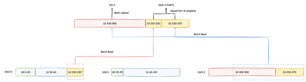 - S2 (435-500) 读取完成后通过 Multi-Part Upload 完成 SO-2 的上传3. S3 (210-230) 和 S3 (230-270) 读取完成后作为 SSO-3 的最后一个 Part 上传