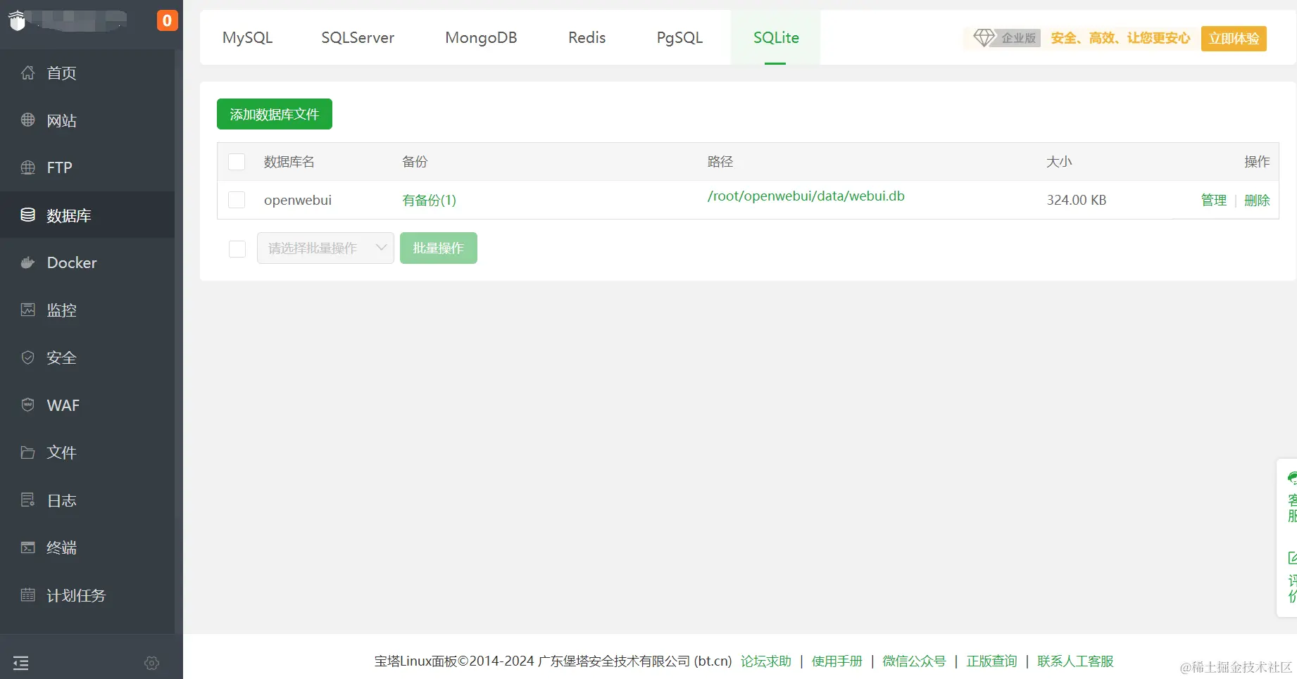 为了方便管理,我用宝塔面板安装了 SQLite 数据库环境,将数据库文件导入进去就能方便的操作了。