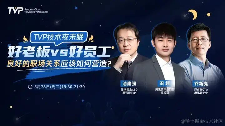 本期 TVP 技术夜未眠,特邀墨问西东 CEO、腾讯云 TVP 池建强& 彩食鲜 CTO、腾讯云 TVP 乔新亮与 腾讯云产品四部总经理 田超展开对谈。5 月28 日(周二)19:30-21:30, 锁定「腾讯云 TVP」视频号,3 位嘉宾将从老板与员工的角度,深入探讨良性职场关系的处理方法,带给你一份职场晋升秘籍。