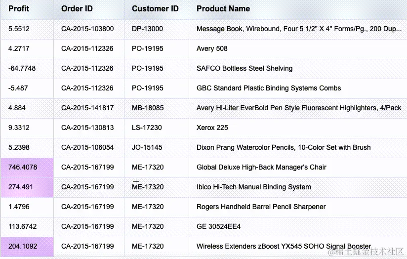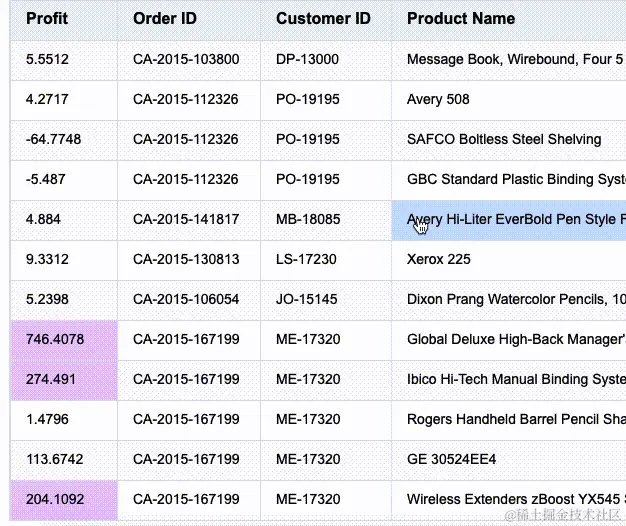 使用场景:默认情况下,设置hover颜色为蓝色,根据不同条件,高亮了一部分单元格为紫色,但需求不希望hover到高亮单元格时也变成了hove蓝r色。