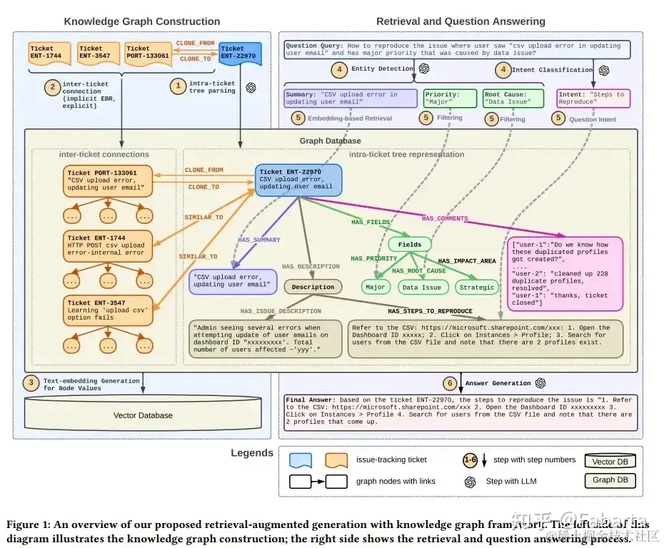 近日,一项突破性的研究为这一难题提供了崭新的解决方案。LinkedIn 的研究团队提出了一种创新的客服自动问答架构,将检索增强生成(Retrieval Augmented Generation,RAG)与知识图谱(Knowledge Graph)完美结合,取得了惊人的效果[1]。通过构建结构化的领域知识库,并引入向量数据库加速语义检索,该方案不仅使问题解决时间大幅缩短,还极大地提升了答案的相关性和准确性。