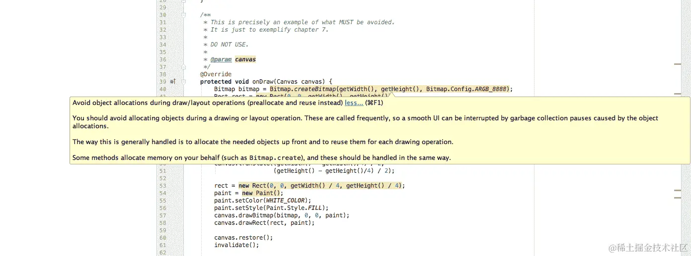 在这个快速示例中,我们在onDraw()方法中分配了多件事情,从Paint对象到Rect对象,再到创建一个新的bitmap,这会分配内部内存。