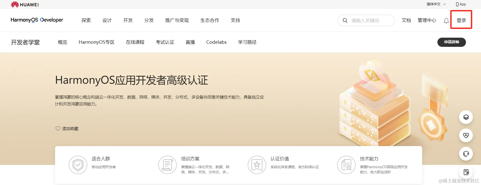 1、打开华为官网链接:HarmonyOS应用开发者高级认证(华为开发者学堂),点击右上角“登陆”