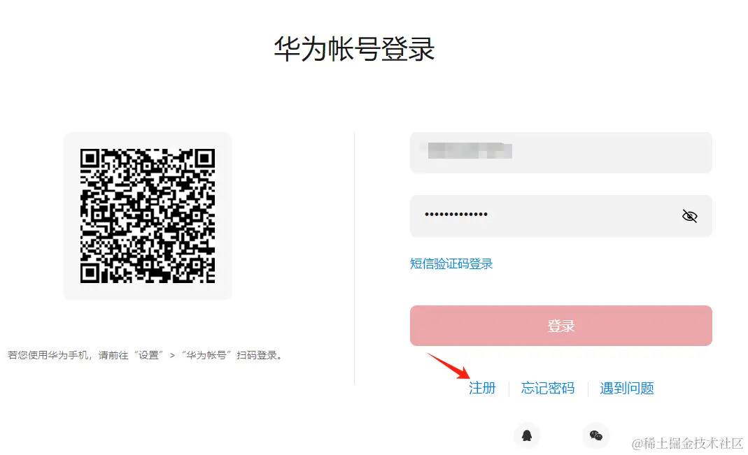 2、如已有华为账号,可以直接输入“账号+密码”或者“账号+验证码”登陆;如还没有注册华为账号的,可以点击下方注册。