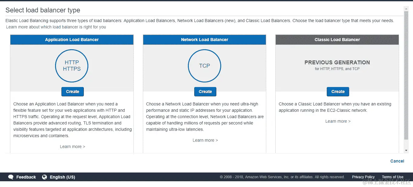 创建一个负载均衡器。您可以选择应用负载均衡器、网络负载均衡器或经典负载均衡器。这些的用途在以下截图中显示: