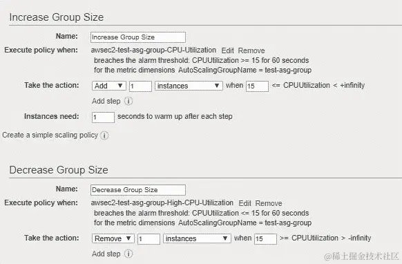 创建一个自动扩展策略,当 CPU 负载大于 20%一分钟时,增加两个实例