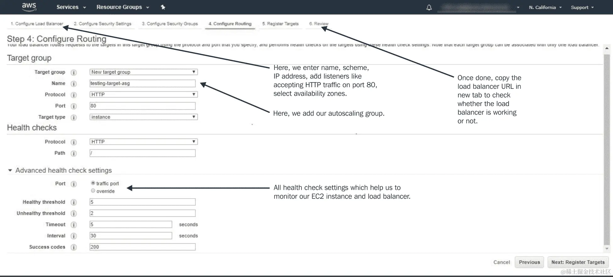 - 下一步是配置负载均衡器,并根据您的要求添加健康检查。所有步骤都可以在以下截图中看到: