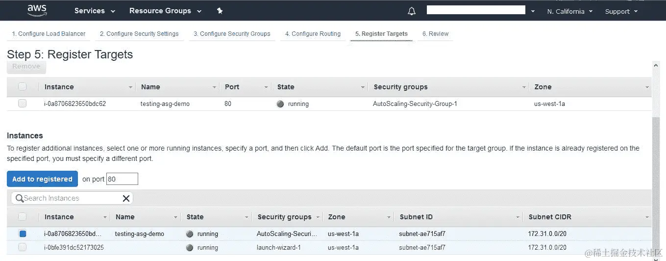 下一步是创建一个应用负载均衡器并将目标组附加到它。因此,创建一个新的 ELB(我们可以使用之前为健康检查配置创建的 ELB)。为目标组添加名称,并在图 5 的第 5 步(配置 ELB 负载均衡器)中,注册由自动扩展组启动的实例: